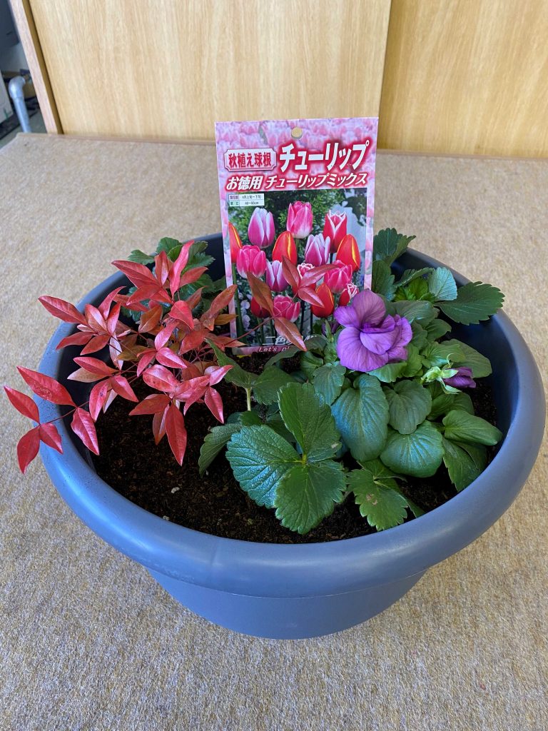 完成した寄せ植えの中にはチューリップの球根が植えられています。
